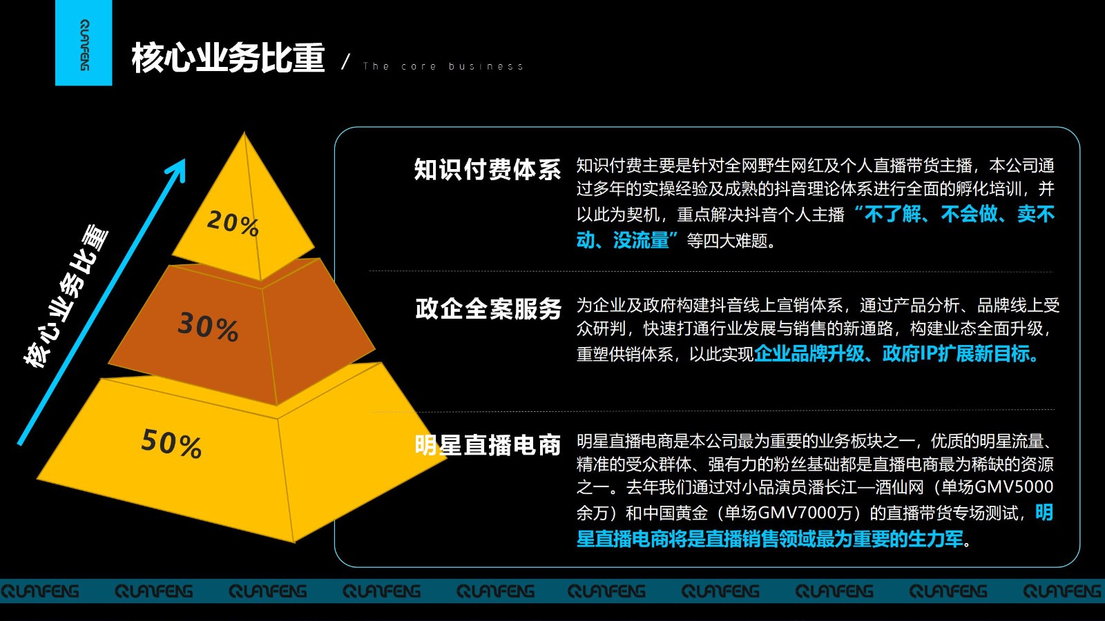 瀚博文化以紅人經(jīng)濟為重心,側(cè)重于藝人互聯(lián)網(wǎng)線上全面發(fā)展、傳統(tǒng)企業(yè)、文旅產(chǎn)業(yè)、城市文化符號線上打造等抖音線上全案。公司自成立以來,先后參與孵化臺灣歌手千百惠、著名小品表演藝術(shù)家潘長江、歌手·演員潘陽、臺灣演員張晨光等多位線上成型藝人。2021年4月-7月,公司兩度參與操盤著名藝術(shù)家潘長江抖音直播帶貨專場,實現(xiàn)了酒仙網(wǎng)帶貨專場單場GMV5000余萬、中國黃金專場單場GMV7000余萬元的最佳抖音線上直播銷售成績。